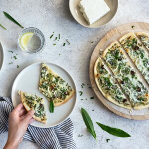 Leider ist die Bärlauch-Saison nur kurz. Hast du vielleicht noch vom aromatischen Kraut im Tiefkühler? Dann rauf auf den Fladen damit! Ansonsten: Rezept abspeichern und im Frühling hervorholen…