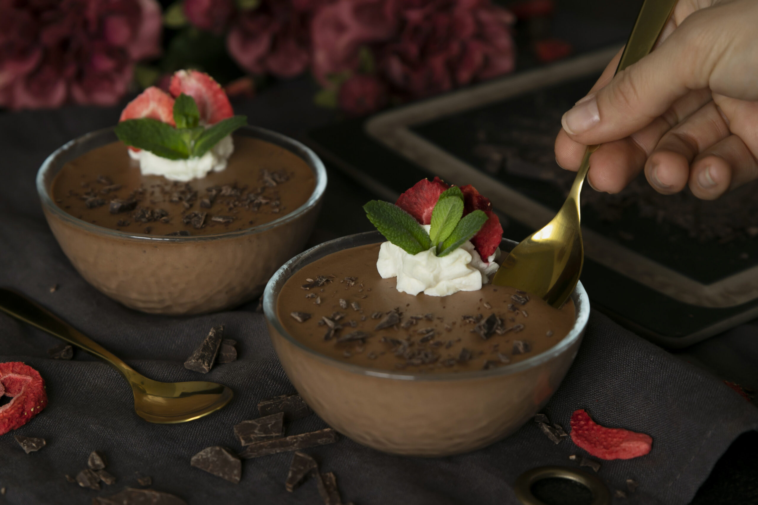 Als Nachtisch folgt ein wunderbar intensives und total simples Schokoladenmousse aus Schweizer Schokolade, optional zusätzlich mit Amaretto-Aroma. Normalerweise gehören in ein Mousse bekanntlich Eier. Diese müssen jedoch getrennt, das Eiweiss aufgeschlagen und dieses dann unter die Masse gehoben werden. Wir wenden einen kleinen Trick an, mit dem ein grosser Teil der Arbeit wegfällt.