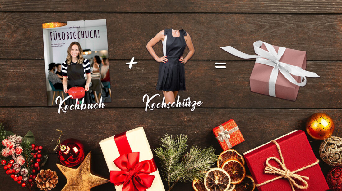 Normalerweise kostet eine unserer hochwertigen Schürzen 49.-, das Cookinesi Kochbuch «Fürobigchuchi» 34.80.- gemeinsam gibt es die beiden Artikel als Geschenkpaket für nur 69.- und das Beste daran – beides wird zusammen liebevoll in Seidenpapier eingeschlagen und in einer Schachtel verschickt, sodass diese nur noch in Geschenkpapier eingepackt und verschenkt werden kann.